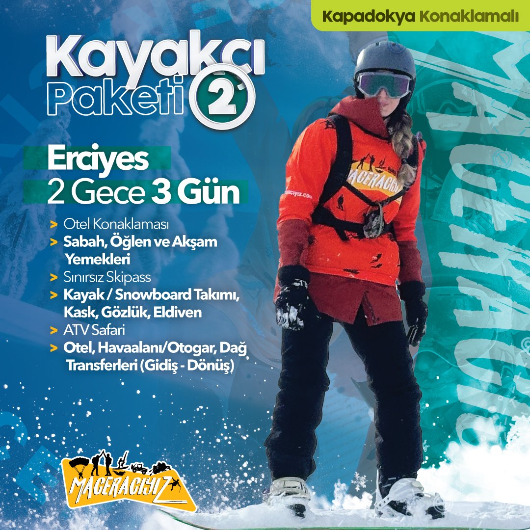 Otelde alacağımız sabah kahvaltısı sonrasında saat 08:30 da transfer aracımız ile Erciyes'e çıkıyoruz. Göremeden Erciyes kayak merkezine ulaşımımız 1 saat 15 dk sürmektedir. Anlaşmalı işletmemizde tercihinize göre kayak veya snowboard ekipmanlarınızı, kask, gözlük ve eldivenlerinizi teslim alıyorsunuz. Bu ekipmanların tamamı ücrete dahildir. Sadece kıyafet kiralamak isteyenler ekstra ücret ödeyerek kar pantolonu ve kar mantonu günlük kiralayabilirler. Ekipman ve kıyafet işlemleri bittikten sonra lider ekibimizden Skipass kartlarınızı ve yemek fişimizi teslim alarak pistlere çıkarak kayak yapmaya start verebilirsiniz.